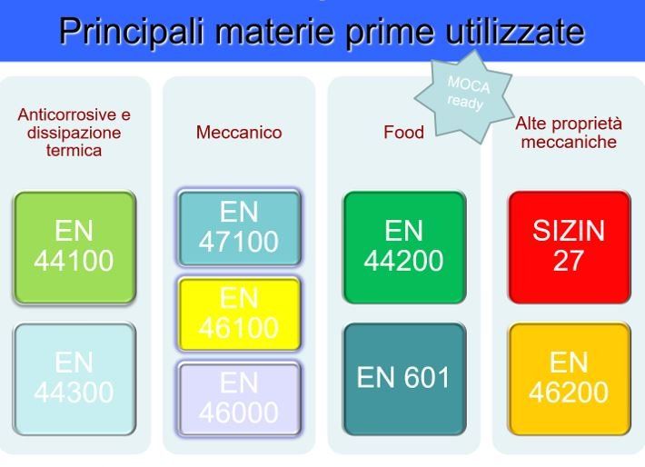 L’azienda da anni utilizza, oltre all'alluminio 46100 comunemente impiegato nella pressocolata, anche diversi altri tipi di leghe con le migliori proprietà meccaniche ed anticorrosive, a richiesta del cliente e secondo le esigenze estetiche, meccaniche, metallurgiche. L'utilizzo mirato delle presse consente l'ottimizzazione della produzione di pressocolate in leghe metalliche.